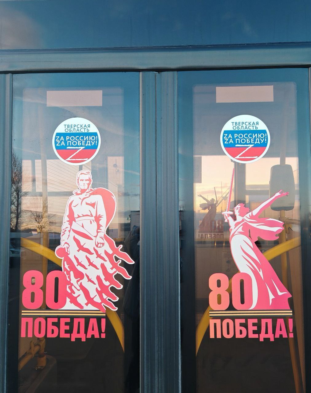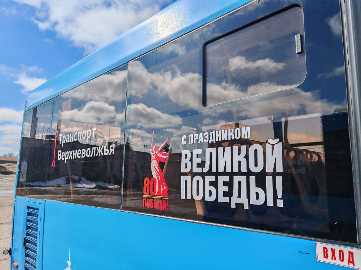 На бортах и стеклах транспортных средств размещены георгиевские ленты, надписи «С праздником Великой Победы!», юбилейный красно-белый логотип 80-летия Победы в Великой Отечественной войне «Родина-мать зовет!», а также символика, посвященная Ржевскому мемориалу Советскому cолдату.