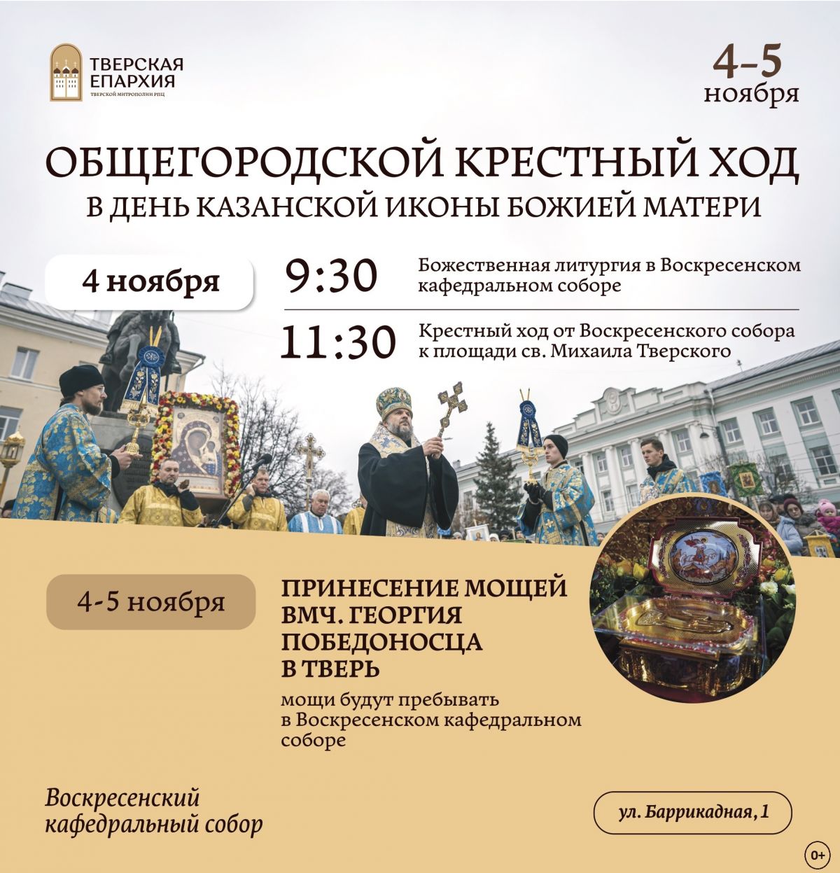 Шествие пройдёт от Воскресенского собора до площади Михаила Тверского, где будет совершён праздничный молебен. Сбор в 11:15