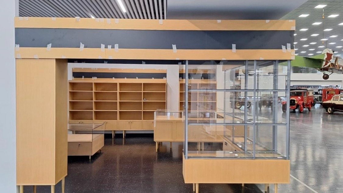 Мебель изготовили с применением шпона ценных пород дерева. Согласно дизайн-проекту, она выполнена в стилистике времён СССР. Это витрины для экспонатов и кафе, сувенирный магазин и гардеробная, офисные помещения для сотрудников - всего больше ста единиц различных позиций.