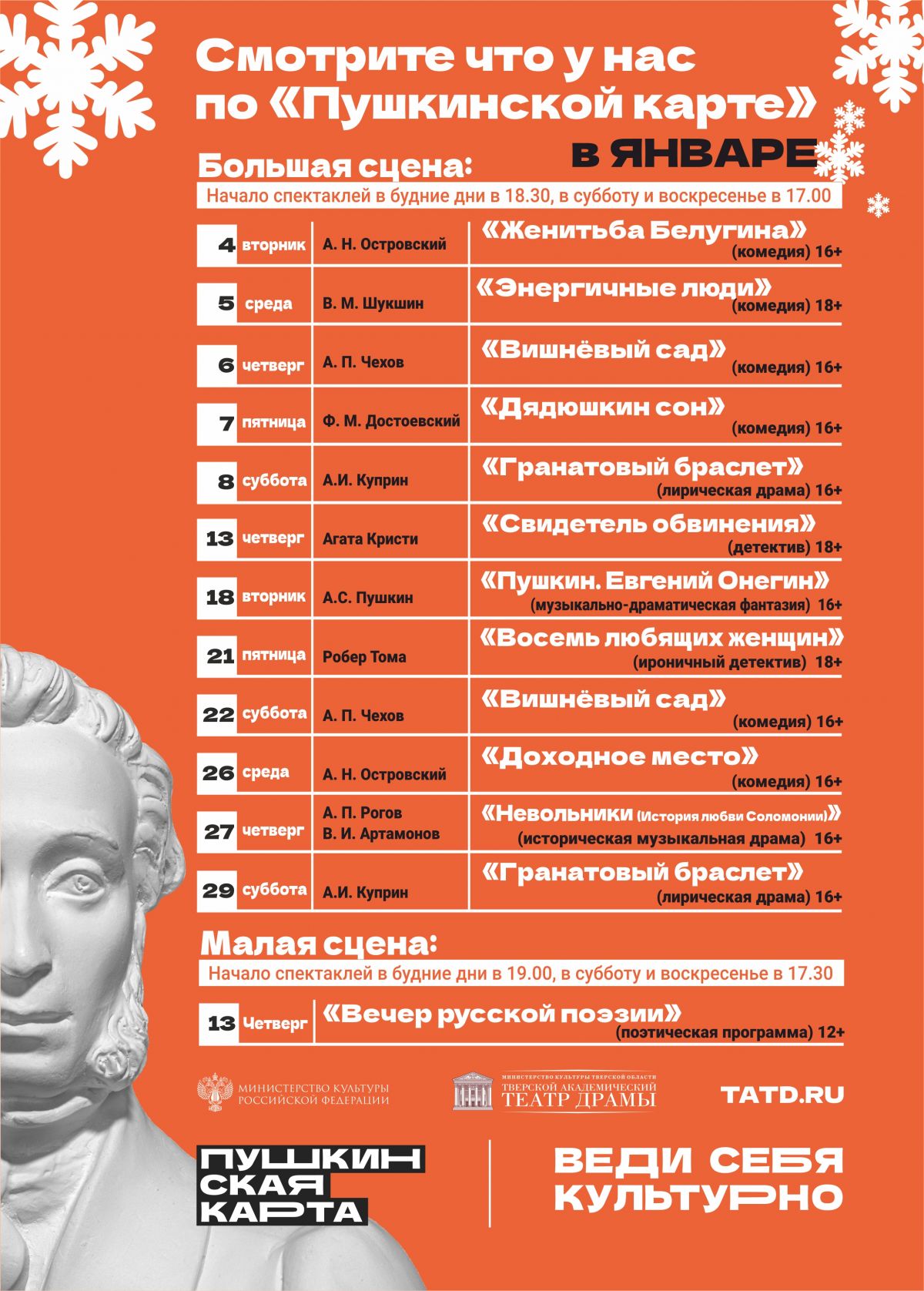 Также подробная афиша всех доступных по «Пушкинской карте» мероприятий регулярно обновляется на портале Культура.РФ