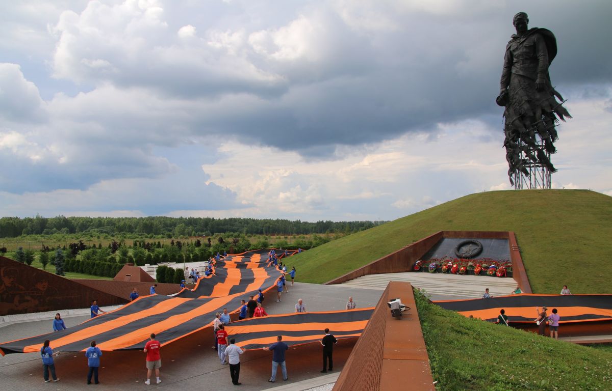 У подножия величественного монумента развернули георгиевскую ленту длиной 300 метров и шириной 7 метров.