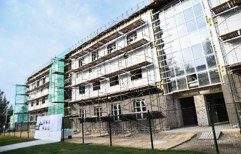 Ранее на объекте возвели стены и междуэтажные перекрытия, установили стропильную кровлю и оконные блоки, а также выполнено устройство перегородок, стяжка пола. Сейчас ведётся прокладка внутренних и наружных инженерных сетей, обустраивается фасад, выполняются кровельные работы, благоустраивается территория.