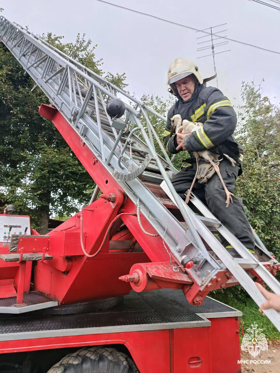 Прохожие заметили птенца, выпавшего из гнезда, и обратились к спасателям. Пожарные поднялись на высоту при помощи автолестницы, чтобы вернуть малыша обратно в гнездо.