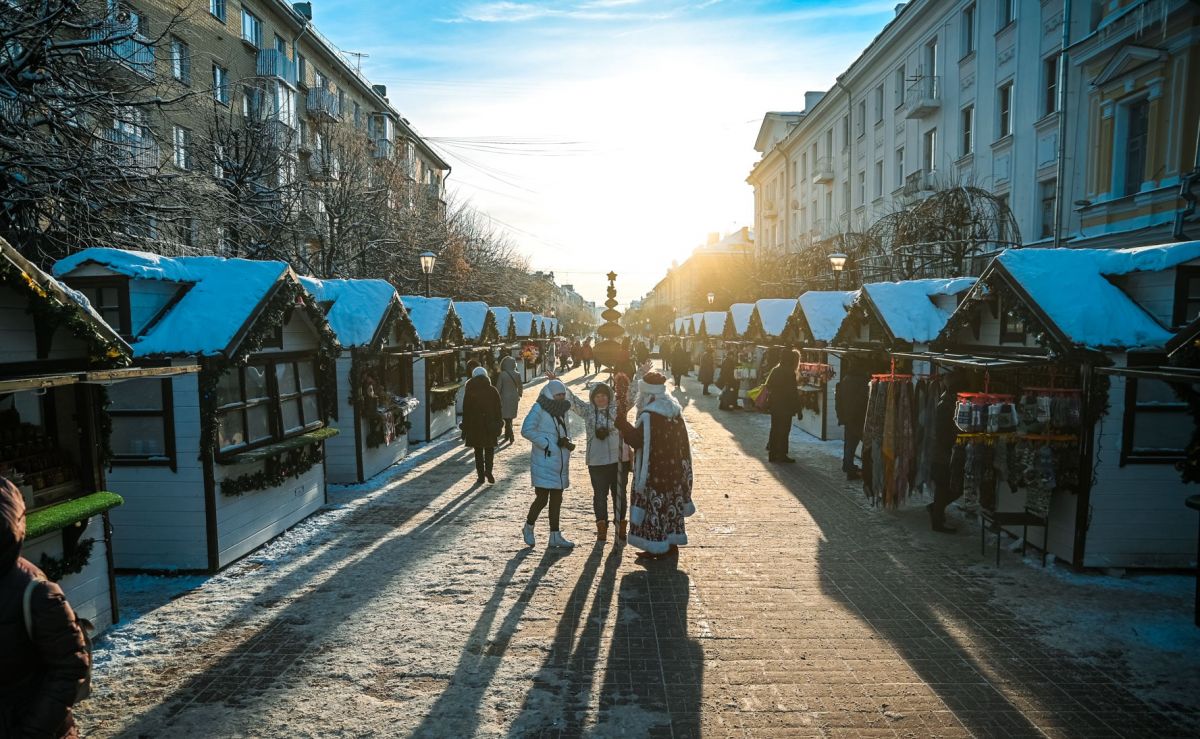 На улице Трёхсвятской установили 24 стилизованных домика, в которых посетители ярмарки могут приобрести ёлочные игрушки, новогодние сувениры, изделия ручной работы.