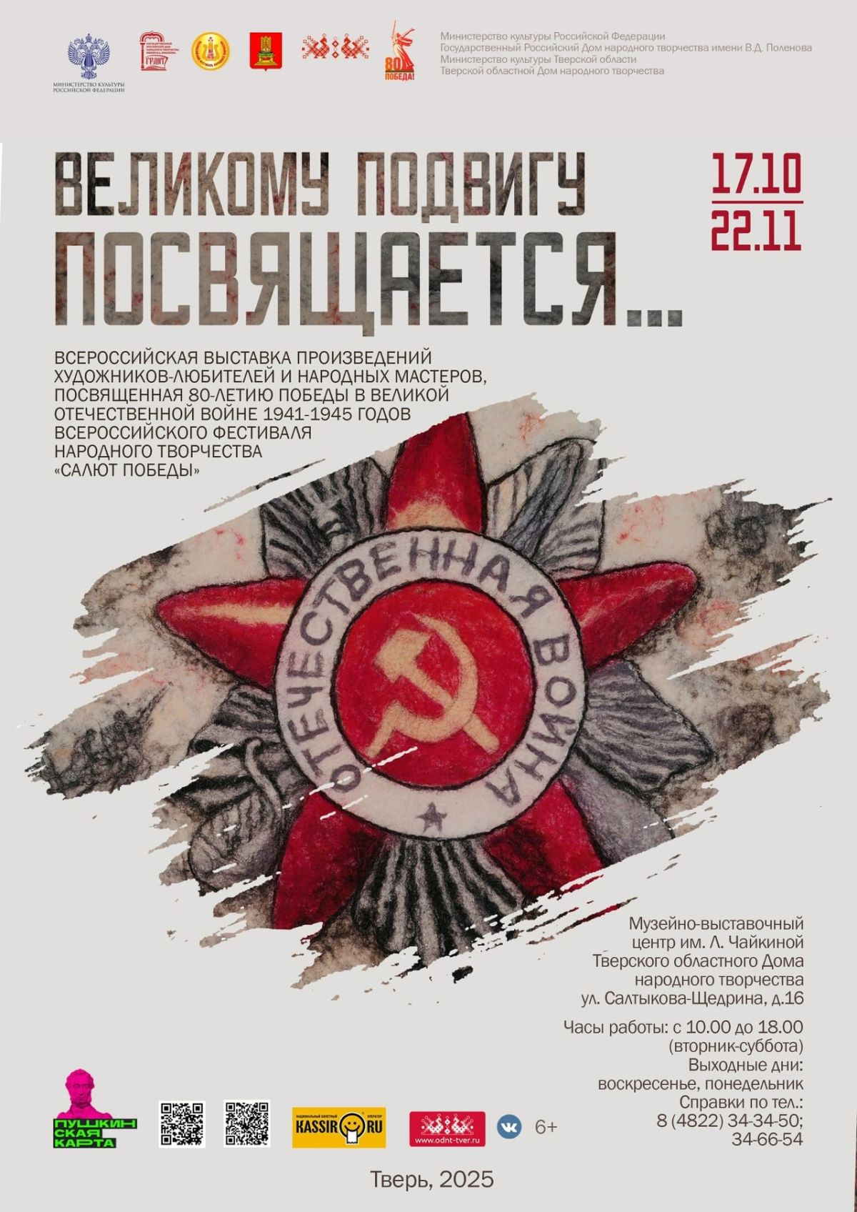 Это итоговая выставка всероссийского фестиваля народного творчества «Салют Победы». В экспозицию включены работы в широком спектре техник, прошедшие трёхэтапный отбор под руководством Государственного Российского Дома народного творчества имени В.Д. Поленова.