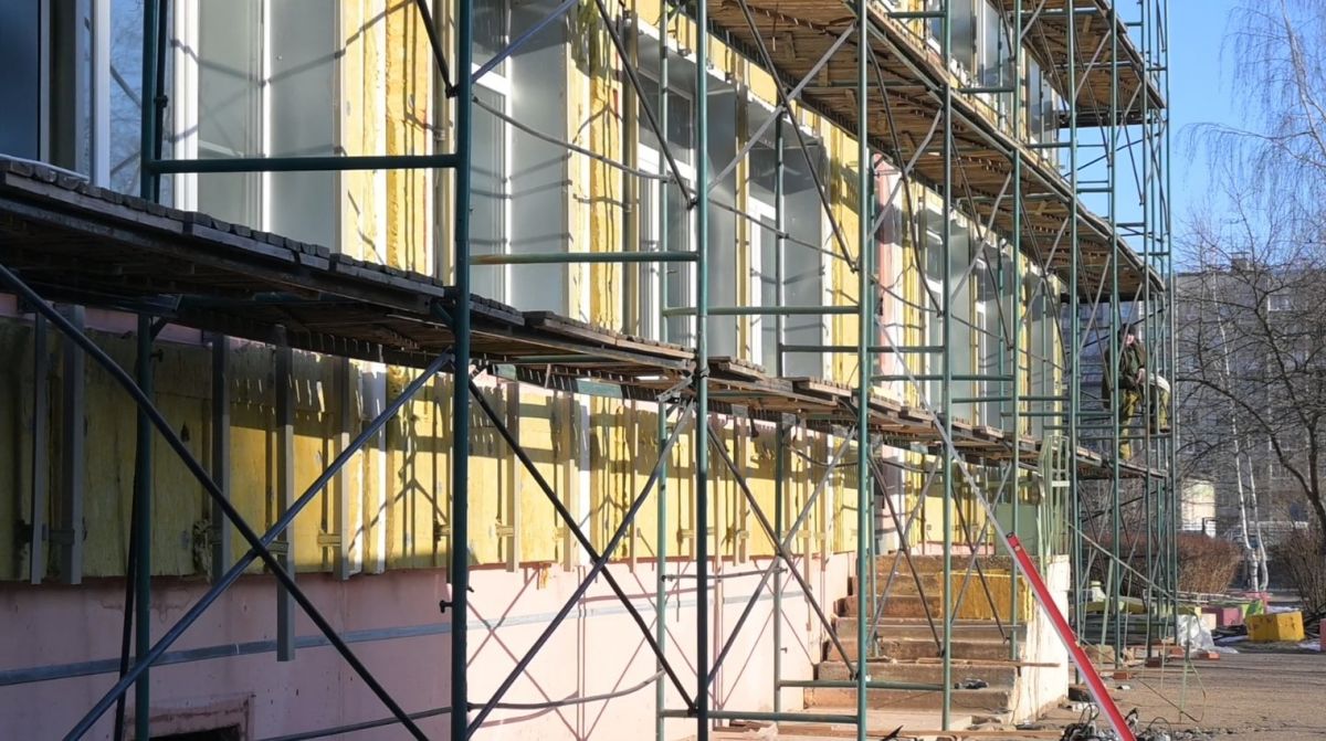 Сейчас в здании школы занимаются наружным утеплением фасада и монтируют несущие профили для установки металлокассет.