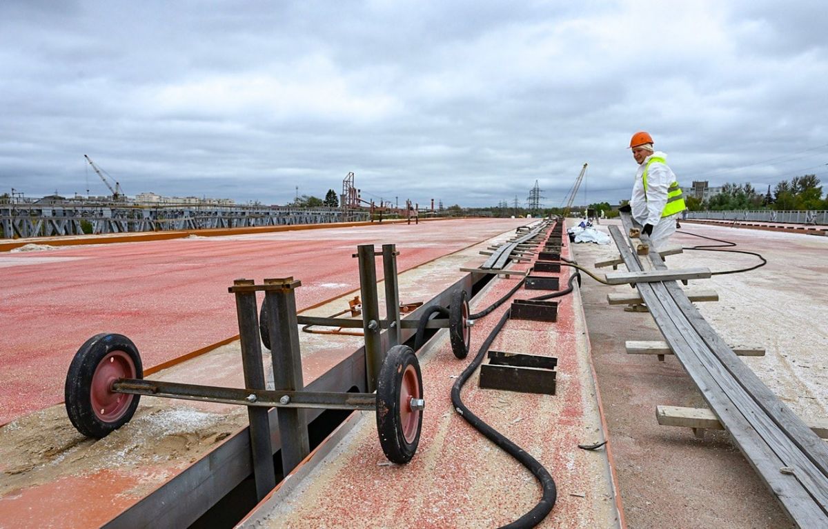 На мосту полностью опустили пролётные строения левого и правого направлений на постоянные опорные части. Продолжается укладка специального гидроизоляционного слоя, сформирована тротуарная часть моста, установлены перила. Кроме того, уже уложили асфальтобетонное покрытие на подходе к мосту - на участке от Санкт-Петербургского шоссе.