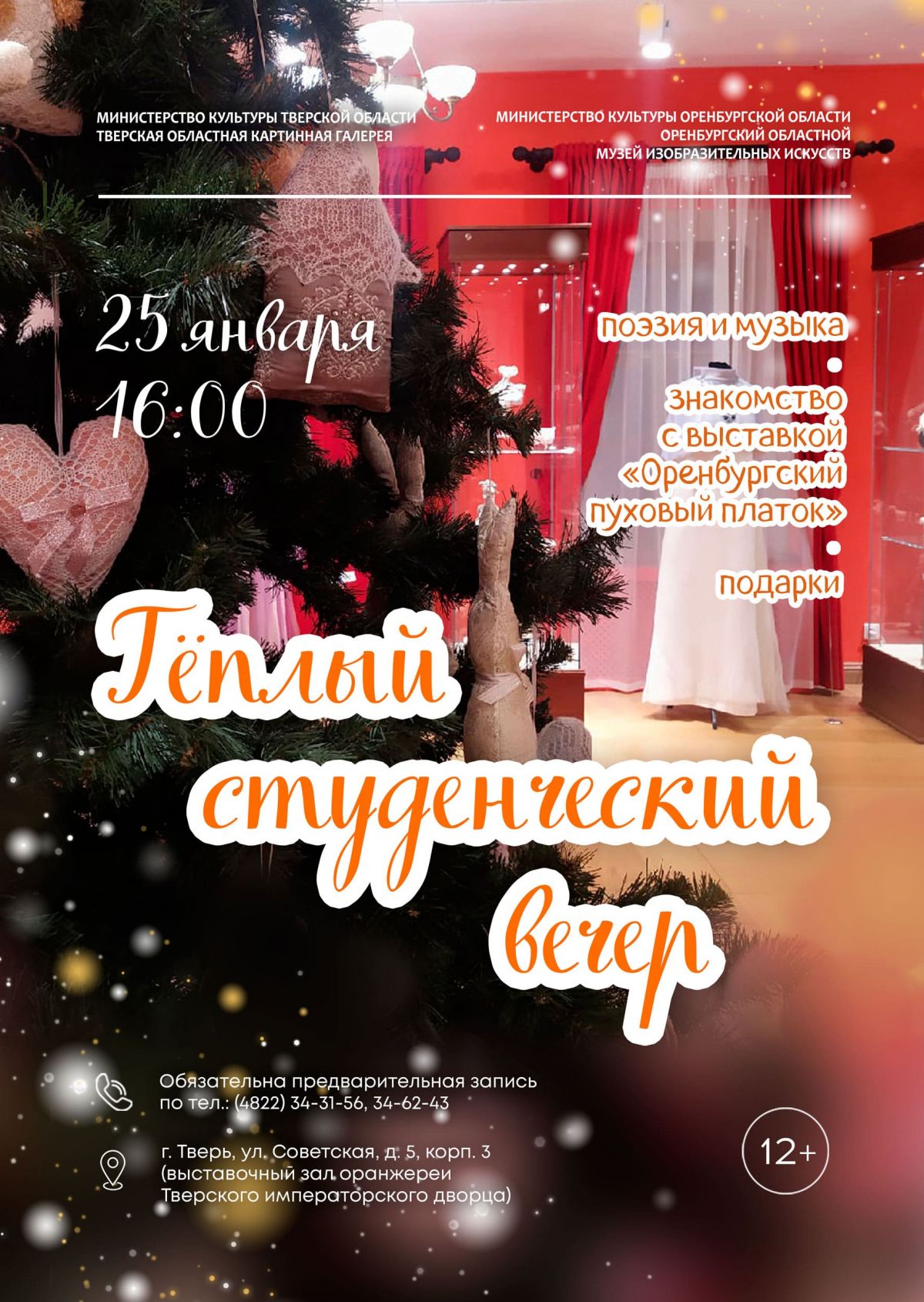 Гости программы смогут вместе отметить День студента, спеть и послушать стихи, окунуться в тепло выставки «Оренбургский пуховый платок» и поучаствовать в розыгрыше подарков от Тверской областной картинной галереи.