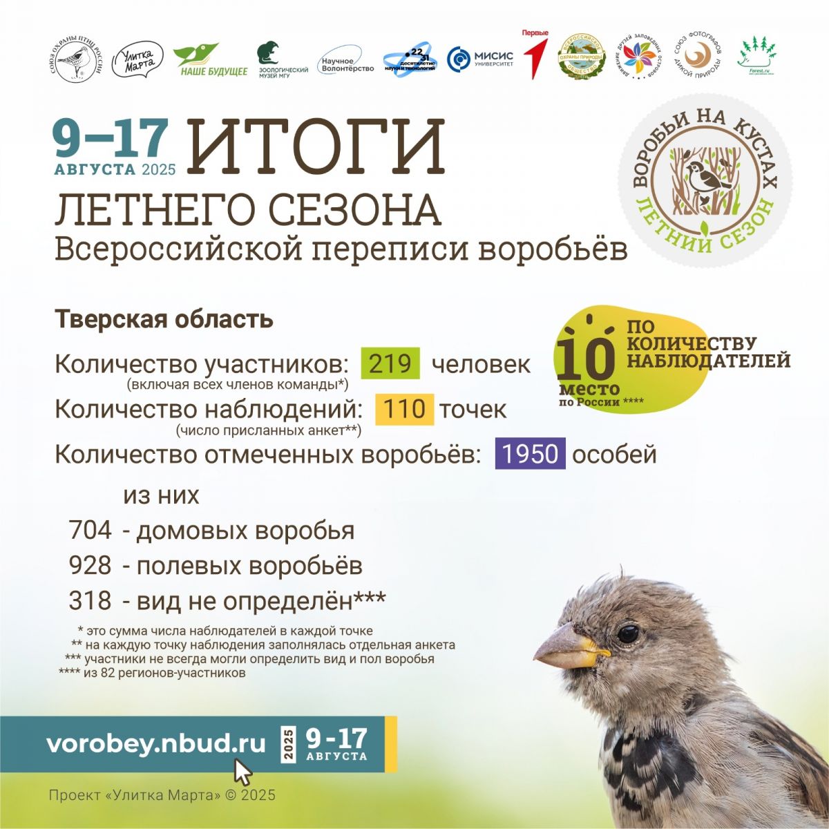 По количеству участников Тверская область оказалась в десятке лидеров. В акции приняли участие 219 любителей природы, из которых 60 человек считали воробьёв впервые.