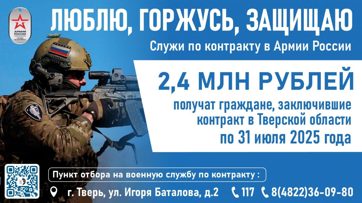 С учётом региональной и федеральной выплат военнослужащие в Тверской области при заключении контракта получают единовременно 2,4 млн рублей.