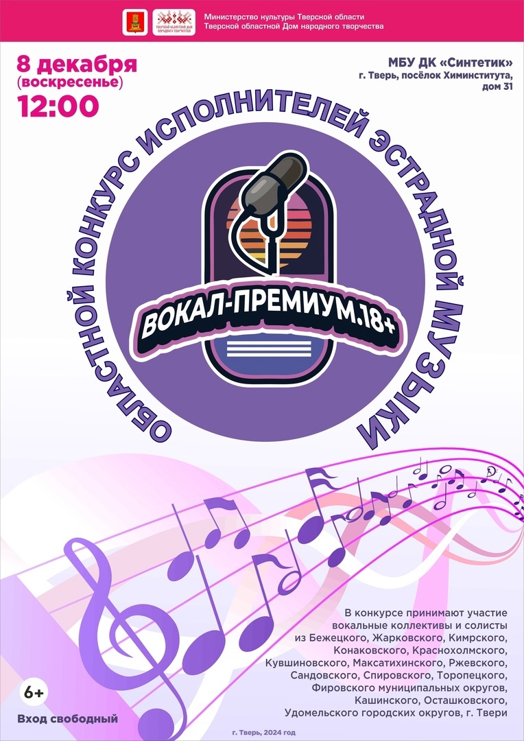 В конкурсе примут участие талантливые вокалисты и ансамбли из Тверской области: Бежецкого, Жарковского, Кимрского, Конаковского, Краснохолмского, Кувшиновского, Максатихинского, Ржевского, Сандовского, Спировского, Торопецкого, Фировского муниципальных округов, а также из Кашинского, Осташковского и Удомельского городских округов и города Тверь.