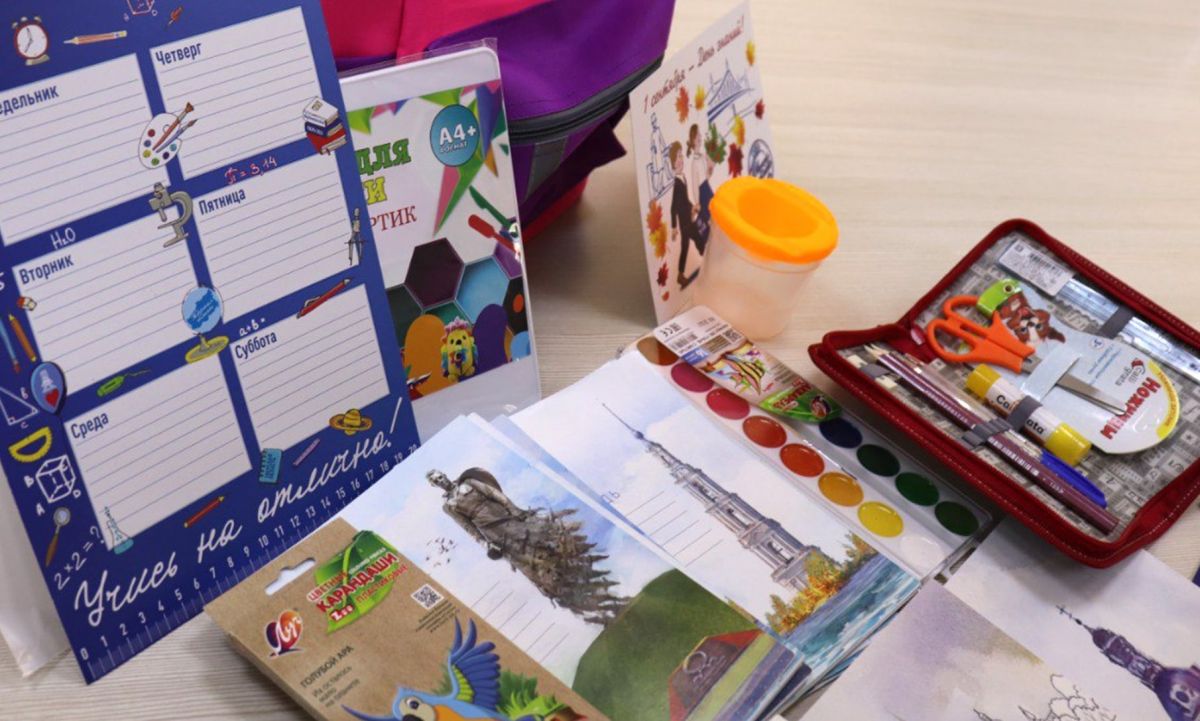 В каждый набор входят рюкзак, тетради и обложки, ручки, карандаши, линейка, точилка, альбом для рисования, набор цветной бумаги и картона, пенал, краски, пластилин, расписание занятий, комплект закладок и другие необходимые для учебы принадлежности. В этом году комплекты дополнят подставкой для книг. В общей сложности в набор включены 24 позиции.