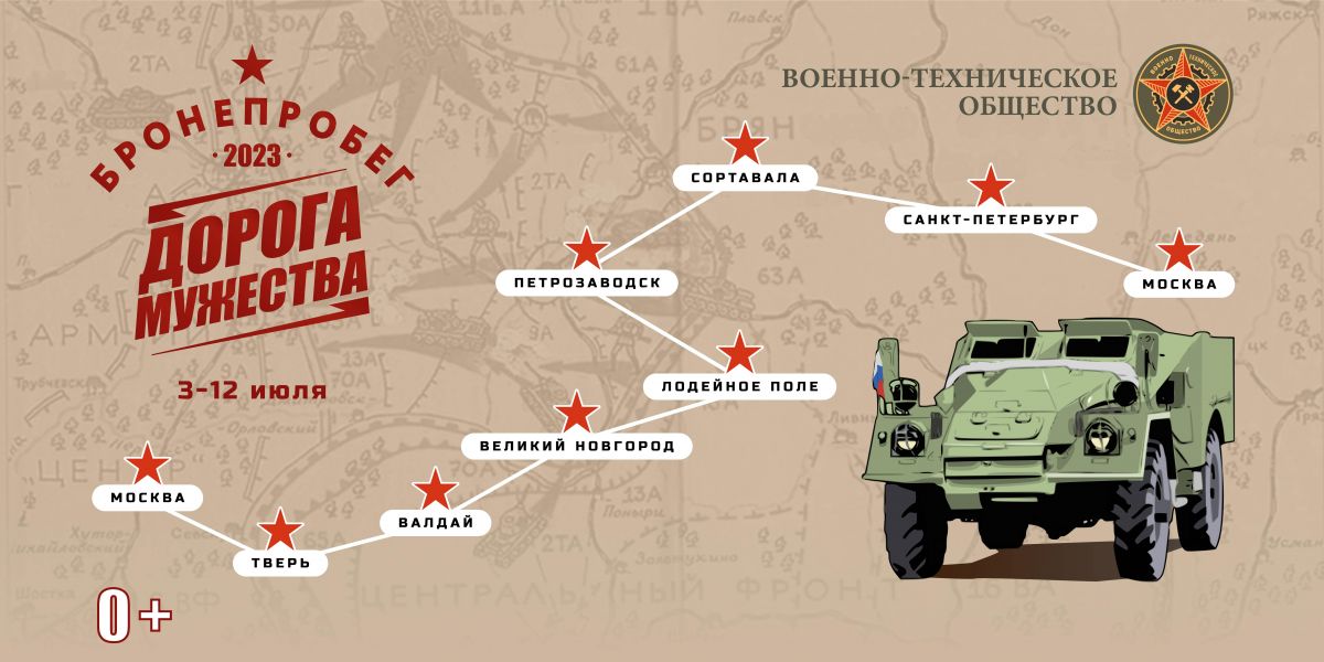 Участники бронепробега проедут на демилитаризованной военной технике порядка 1900 километров по маршруту Москва — Тверь — Валдай — Великий Новгород — Лодейное поле — Петрозаводск — Сортавала — Санкт-Петербург — Валдай — Москва. Старт акции назначен 3 июля в 10:00 на Поклонной горе в Москве.