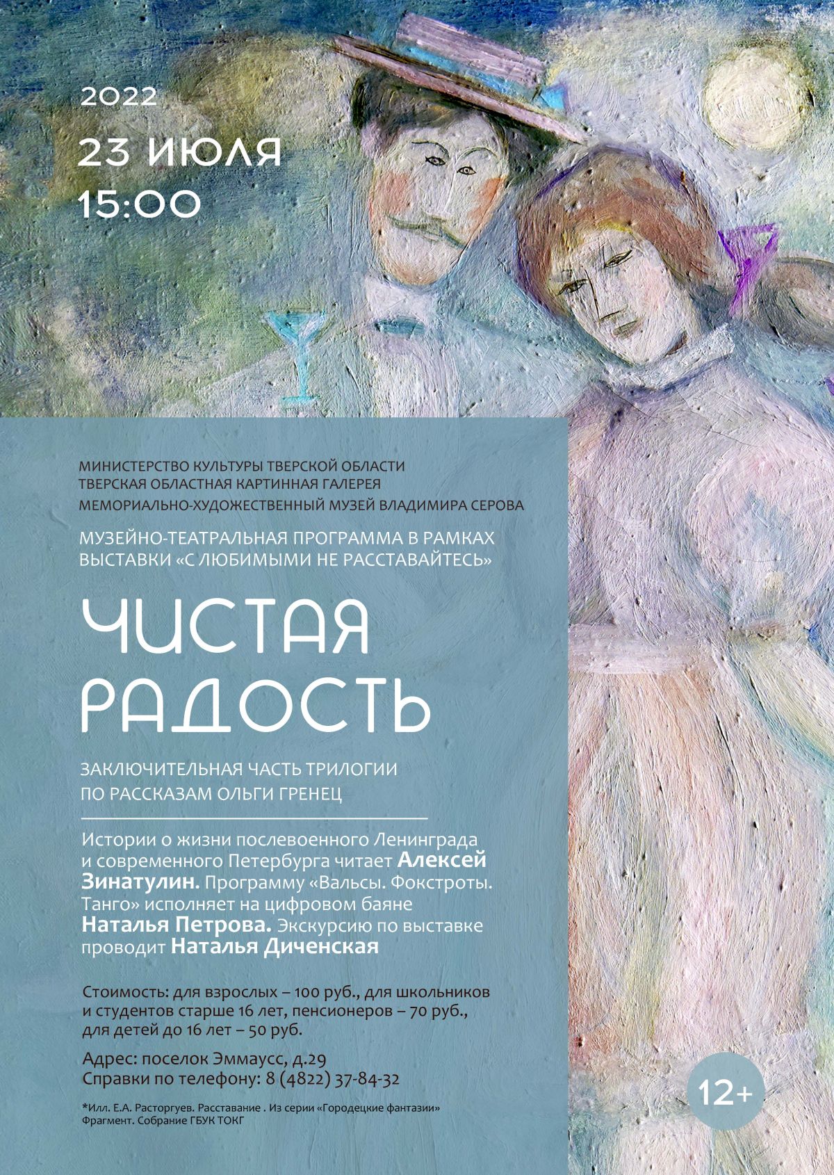 Постановка сопровождается живой музыкой: программу «Вальсы, фокстроты, танго» исполнит на цифровом баяне лауреат международных конкурсов Наталья Петрова. А экскурсию по выставке «С любимыми не расставайтесь» проведет Наталья Диченская.