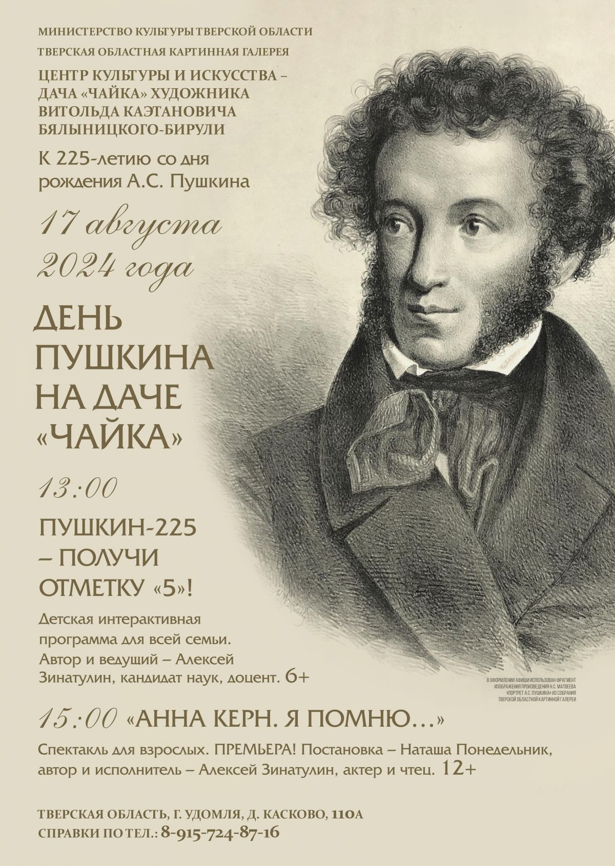 В 13:00 гостей ждёт детская интерактивная программа для всей семьи «Пушкин-225 – получи отметку «5»!» (6+).