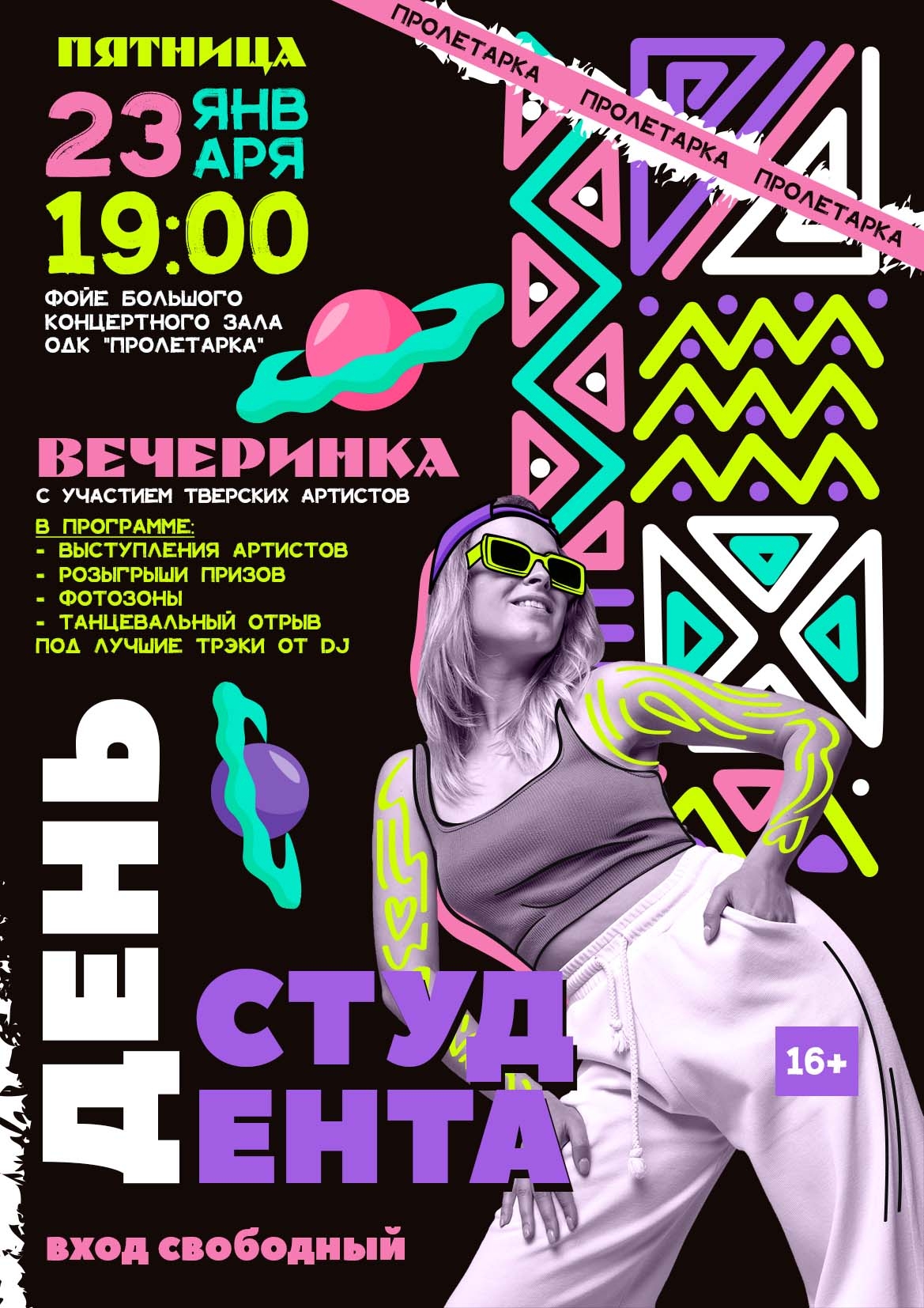 Гостей ждёт насыщенная программа: выступления молодых тверских артистов: Алёна Медкова, Анна Соколова, Всеволод Мишуров, Екатерина Тахиева, ведущий Владимир Крылов (артисты Тверского ТЮЗа), диджей-сет от DJ SATORU и атмосфера настоящего студенческого праздника.