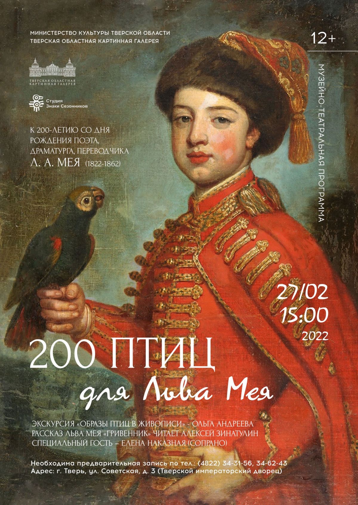 Гостей программы ждёт прогулка по постоянной экспозиции галереи, стихотворения Мея и рассказ об образах птиц в произведениях искусства, представленных в Тверском императорском дворце.
