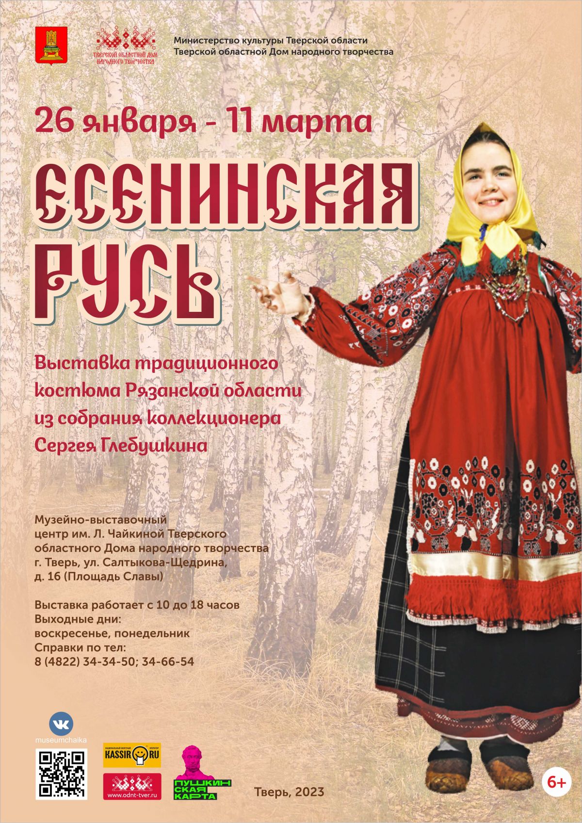 Выставка посвящена рязанскому народному костюму, о котором так часто писал в своих произведениях Сергей Есенин. В экспозиции представлено 30 этнографических комплексов, которые включают в себя повседневные, праздничные, траурные и девичьи наряды, а также головные уборы и аксессуары.