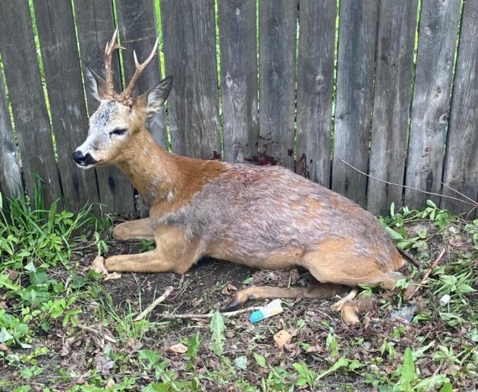 Животное лежало у забора рядом с частным домом. На шее и теле косули виднелись повреждения. Предположительно, она получила раны от укусов животных.