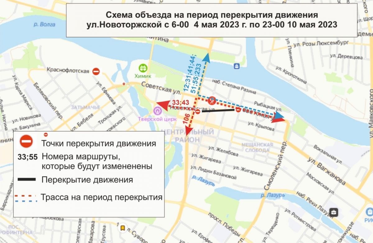 C 6:00 4 мая до 23:00 10 мая в связи с подготовкой к параду, приуроченному к празднованию 9 мая, будет перекрыт участок улицы Новоторжская от Студенческого переулка до площади Святого Благоверного Князя Михаила Тверского.
