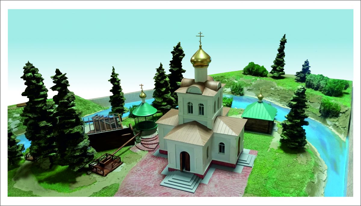 Макет изготавливали в течение года с помощью карт местности, фотографий, чертежей. На нём показаны храм во имя Преображения Господня, колодец, купель и излучина левого берега реки Пырошни. История этого уникального источника напрямую связана с явлением чудотворной иконы Богоматери Оковецкой (Ржевской).