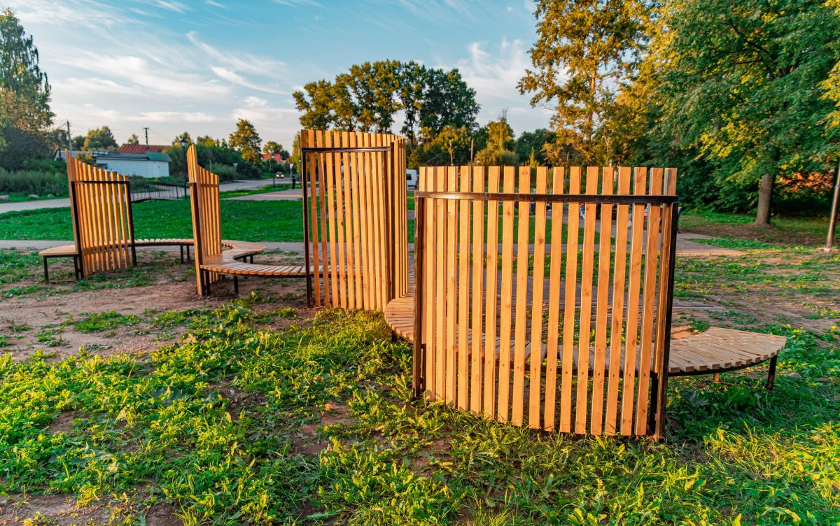 На благоустроенной территории Литературного сквера в Калязине воплотили в жизнь проект «Литературные кружева» - там появилась конструкция в виде изогнутой скамьи.