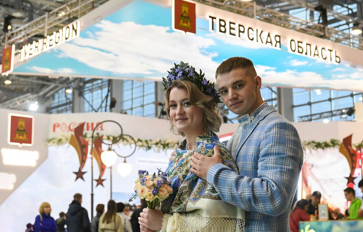 Молодожёны приняли участие в праздничном шествии, после заключения брака исполнили свой первый танец. На стенде Тверской области молодым вручили подарок от тверского региона.