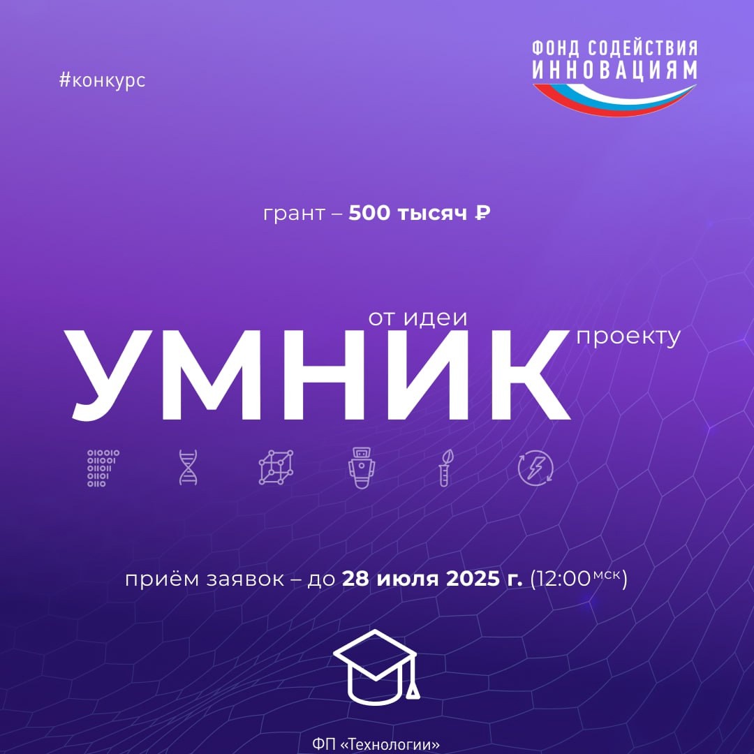 По итогам участия в конкурсе можно получить грант в размере 500 тысяч рублей. Основные условия конкурса, требования к участникам и рекомендации по подготовке заявки можно найти на сайте fasie.ru. Заявки будут приниматься до 12:00 28 июля.