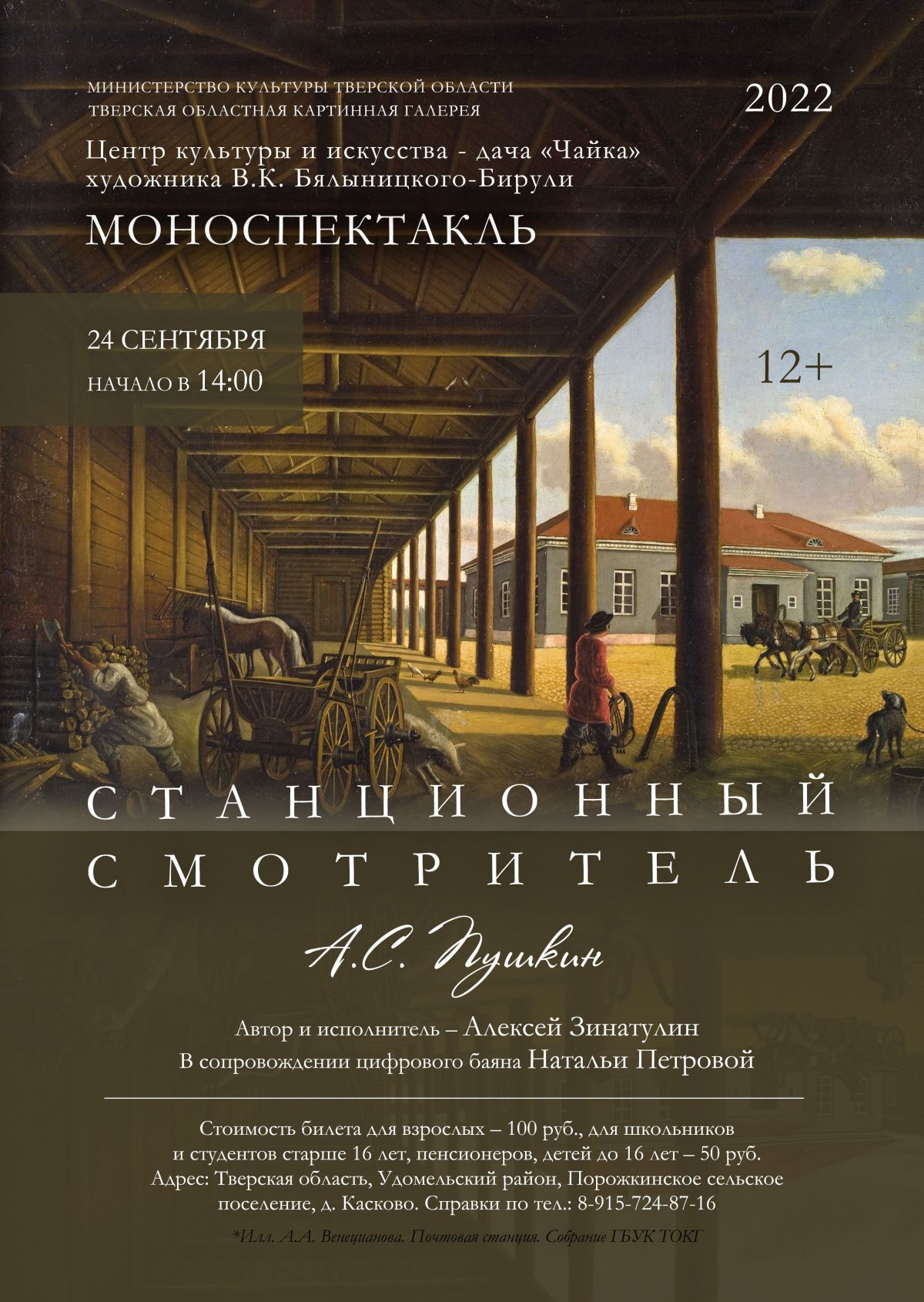 Для зрителей прочтут повесть И. П. Белкина, записанную Пушкиным в Болдино 14 сентября 1830 года. В центре спектакля вопрос: станционный смотритель Самсон Вырин – диктатор или мученик? Ответы у каждого персонажа – а в моноспектакле ярко предстают даже эпизодические герои – свои. Автор и исполнитель – А. Зинатулин.