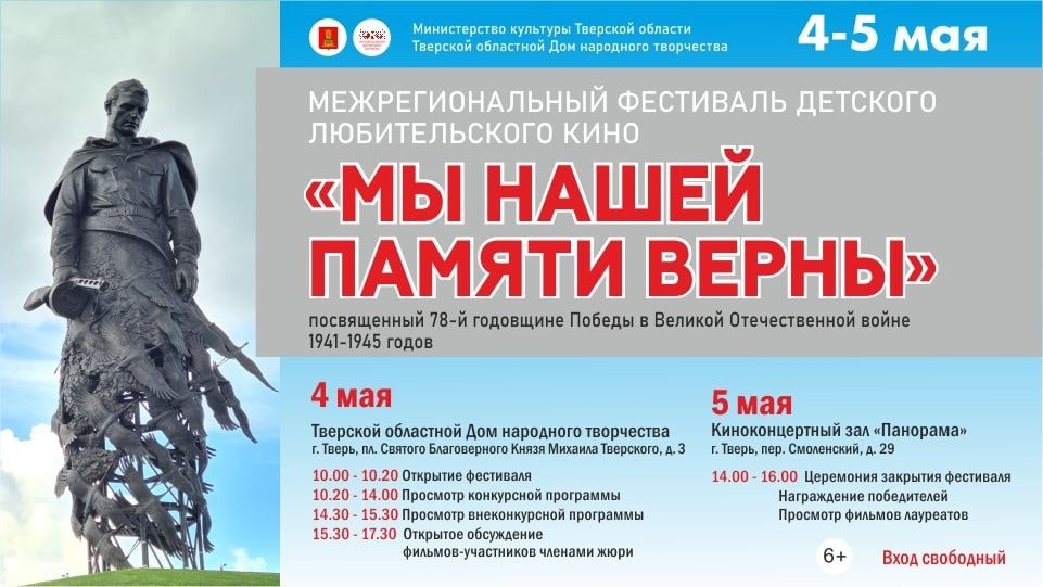 4 мая в 10:00 в Тверском областном Доме народного творчества состоится открытие фестиваля и просмотр конкурсных работ детских и юношеских видеостудий из Архангельской, Белгородской, Нижегородской, Рязанской, Свердловской и Тверской областей, Республик Башкортостан и Марий Эл, Красноярского края, Москвы и Санкт-Петербурга. Тверскую область представят кино-видео студии из 14 муниципалитетов региона.
