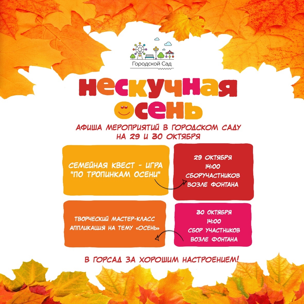 А в воскресенье, 30 октября, все желающие смогут принять участие в творческом мастер-классе на тему осени (0+). Начало в 14:00.