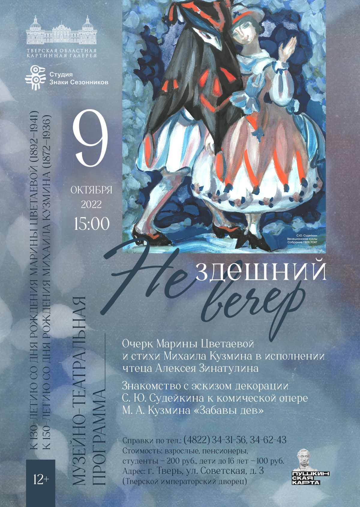 В исполнении чтеца Алексея Зинатулина прозвучат очерк Марины Цветаевой и стихи Михаила Кузмина. В музейной части программы зрители познакомятся с эскизом декорации к комической опере М.А. Кузмина «Забавы дев», оформленной художником Сергеем Судейкиным в 1911 году.