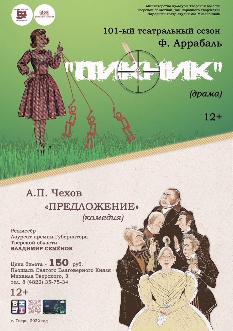 А спектакль «Пикник» (12+) поставлен по одноименной пьесе классика Фернандо Аррабаля. В характерной для него драматургии спектакль создаёт пространство, где сплетаются различные театральные приемы и формы. В начале действо выглядит как поле абсурда и фарса, а в развитии сюжета оно становится суровой трагедией человеческих жизней.