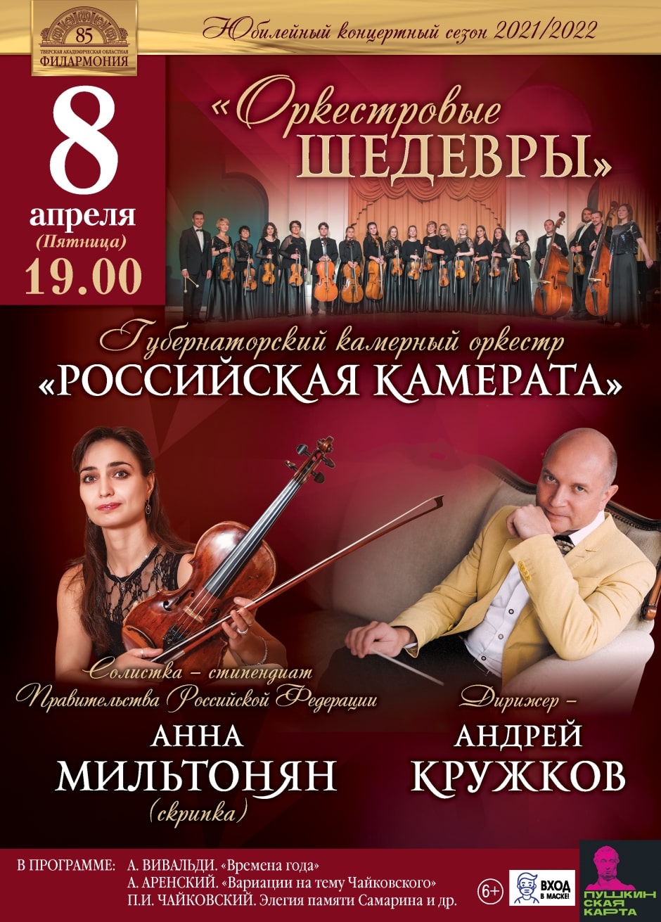 На сцене филармонии перед слушателями выступит Губернаторский камерный оркестр «Российская камерата» под управлением дирижера Андрея Кружкова. Солистка - стипендиат Правительства Российской Федерации Анна Мильтонян (скрипка).