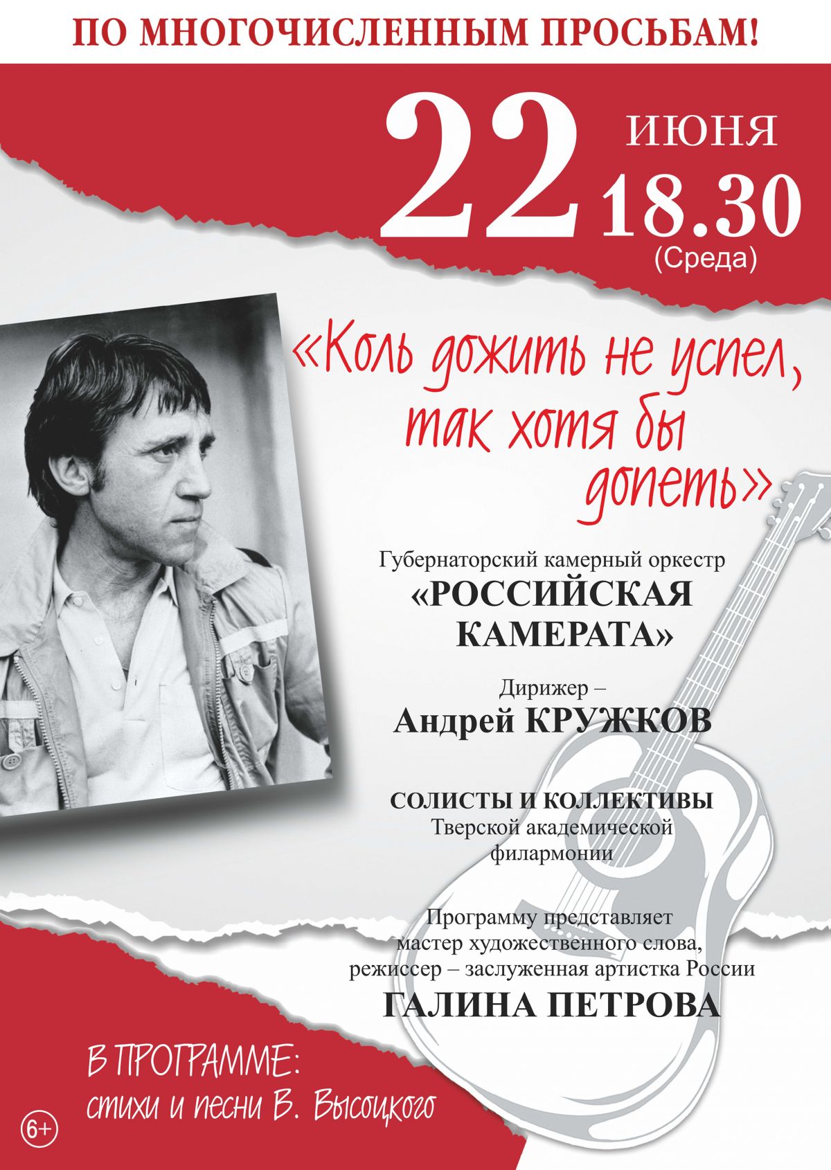Перед зрителями выступят солисты и коллективы Тверской филармонии. В программе – песни Владимира Высоцкого.