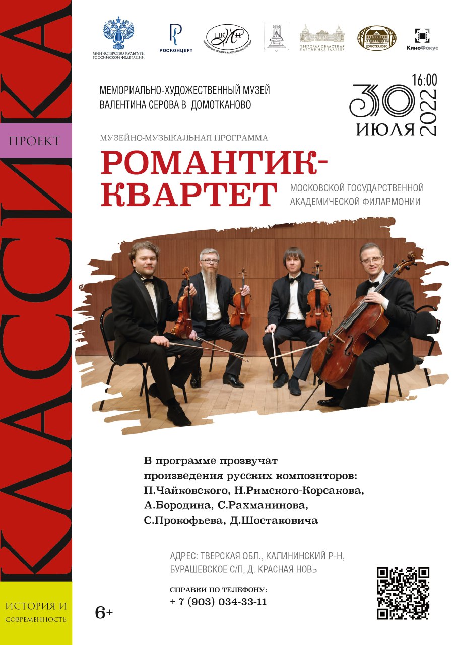 Это известный камерный коллектив России, выступающий в лучших традициях русского квартетного искусства. В живописном усадебном парке для гостей в исполнении музыкантов прозвучат произведения великих русских композиторов: П. Чайковского, Н. Римского-Корсакова, А. Бородина, С. Рахманинова, С. Прокофьева, Д. Шостаковича.