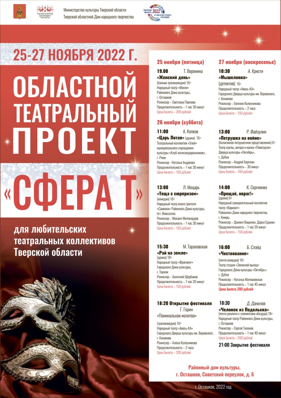 26 и 27 ноября в районном Доме культуры в Осташкове спектакли различных жанров представляют актеры из Осташковского и Кимрского округов, Торжокского, Максатихинского, Конаковского, Торопецкого районов и города Дубна Московской области.