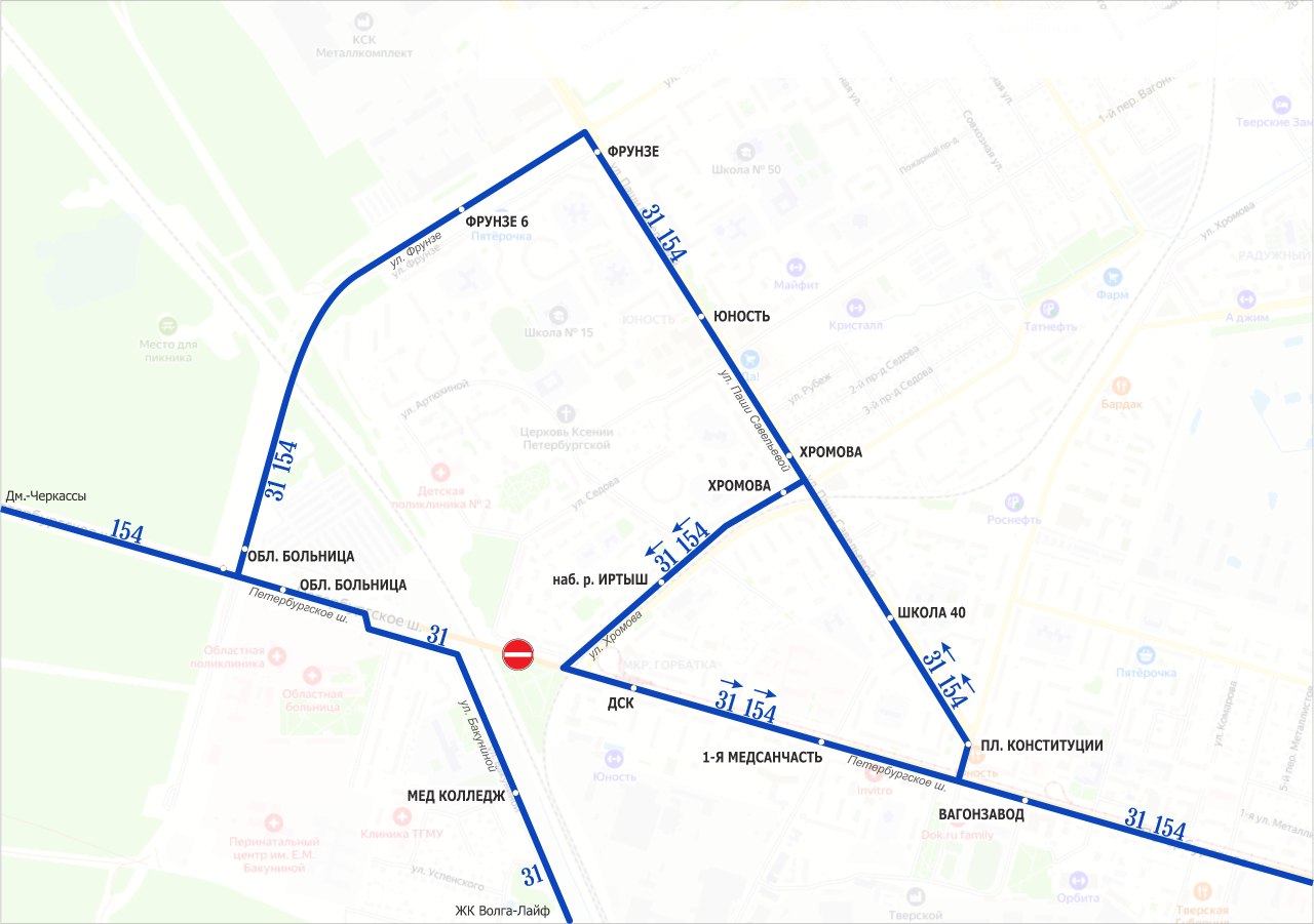 Остановочные пункты в прямом направлении: Улица Артюхиной, Школа № 7, Микрорайон Юность, Микрорайон Юность, Улица Фрунзе, Улица Фрунзе дом № 6, Областная больница, Медицинский колледж, Улица Болотникова, Жилой комплекс Волга-Лайф.