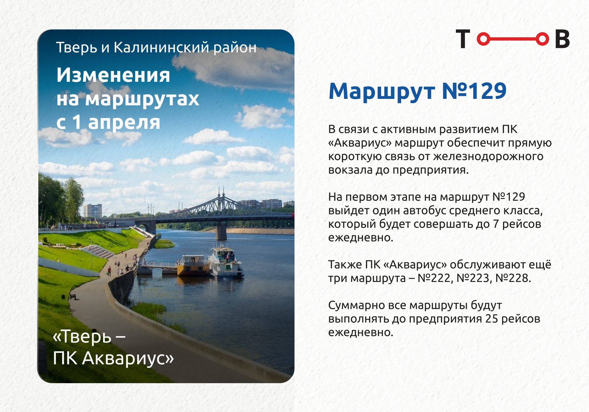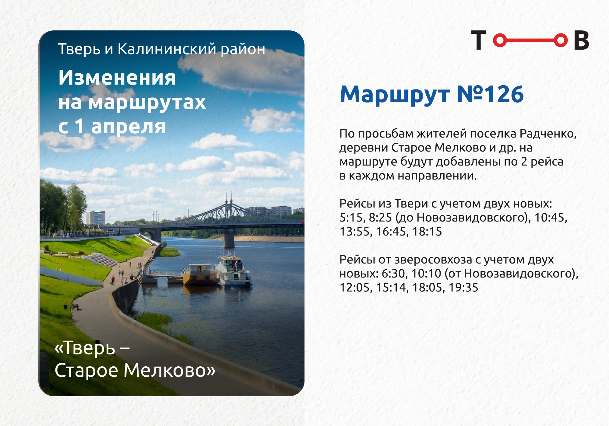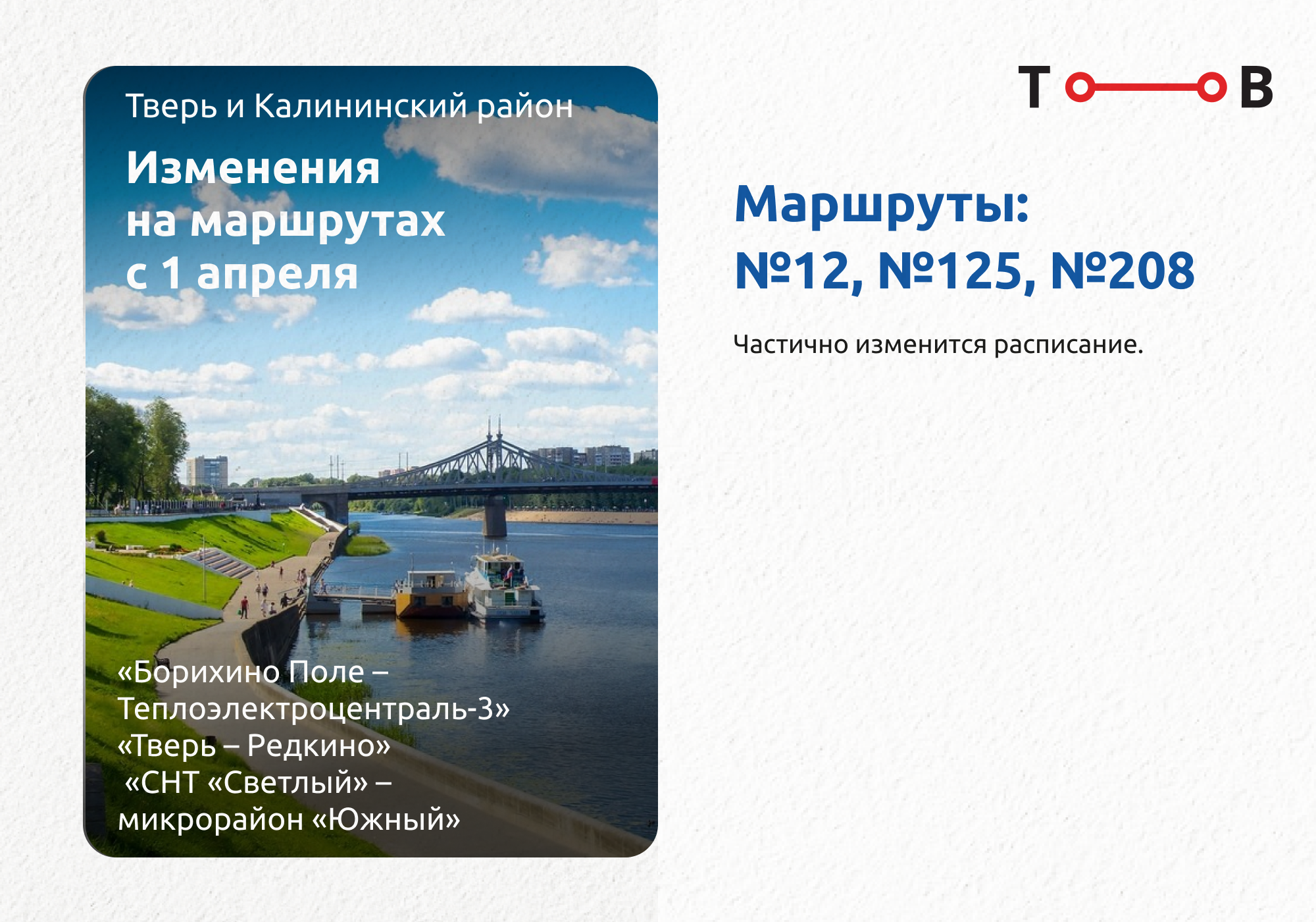 По просьбам пассажиров с 1 апреля «Транспорт Верхневолжья» скорректирует расписание и схему движения нескольких маршрутов в Твери, Калининском, Ржевском и Зубцовском районах.