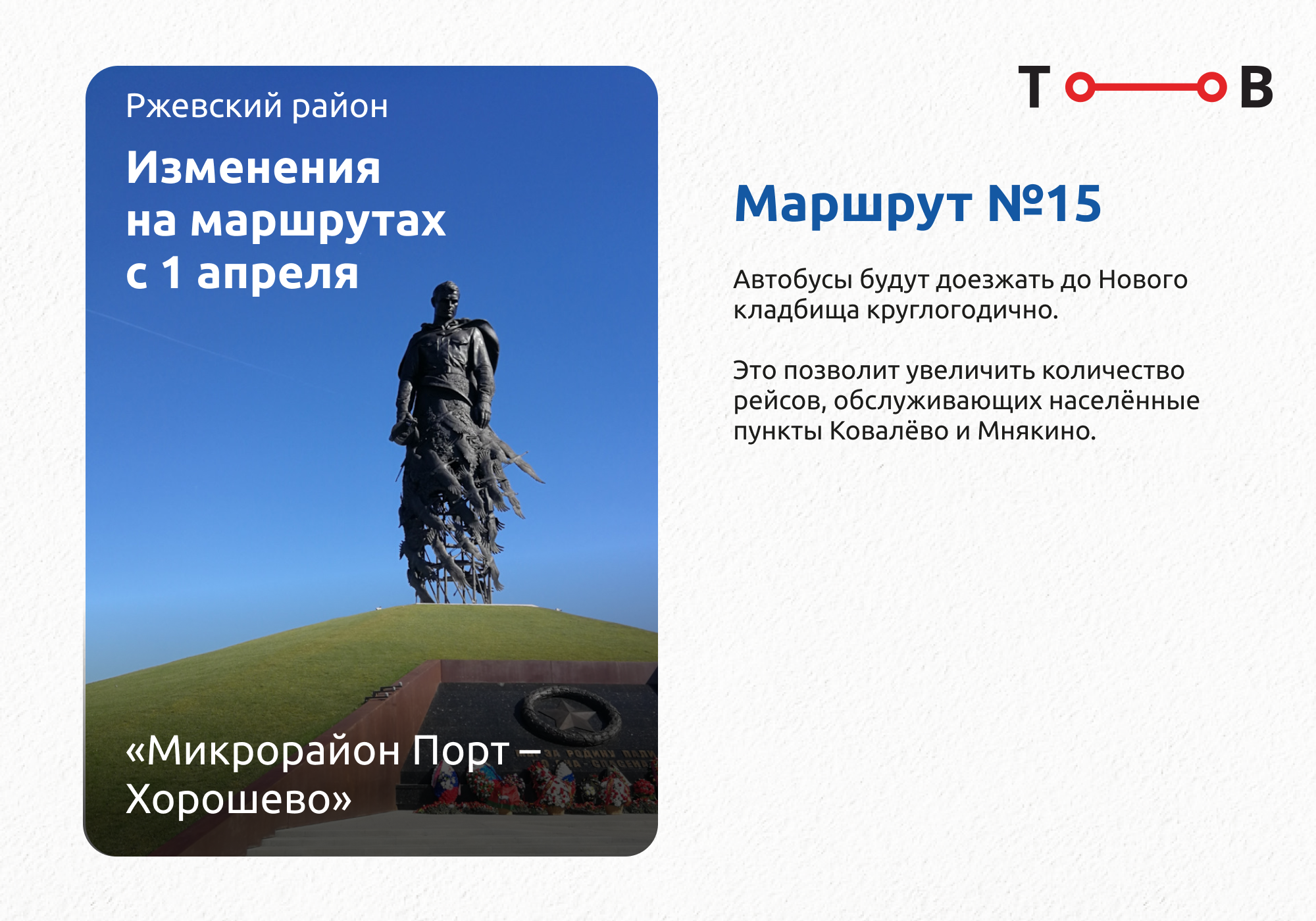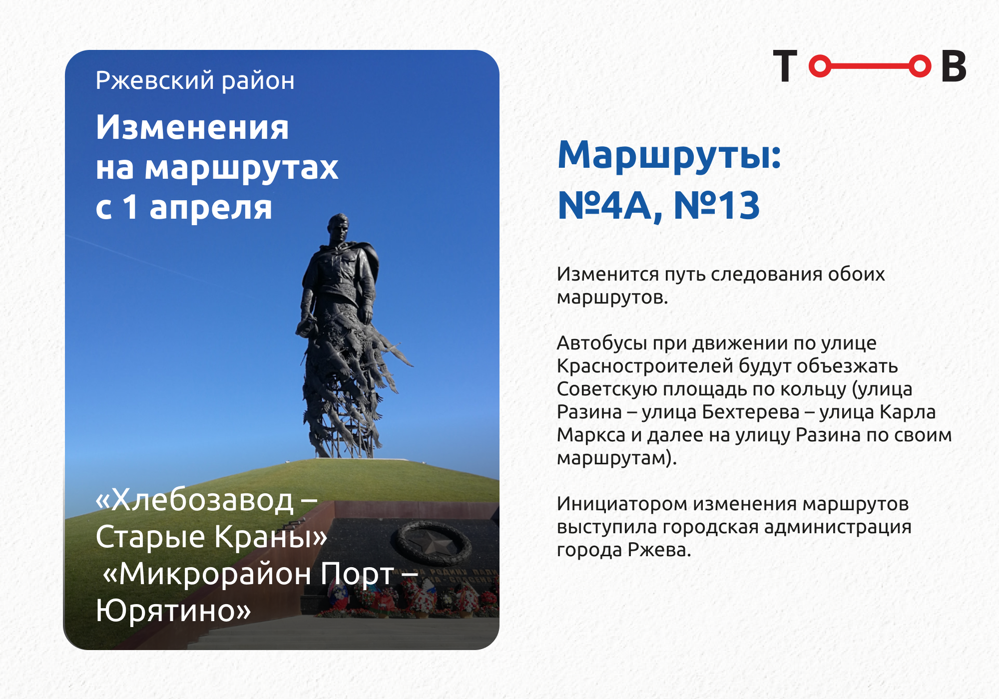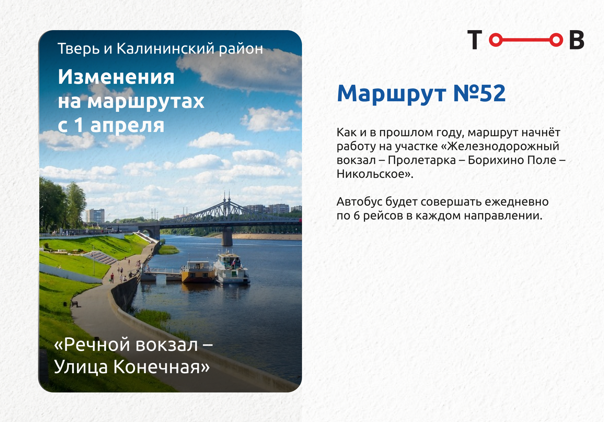 По просьбам пассажиров с 1 апреля «Транспорт Верхневолжья» скорректирует расписание и схему движения нескольких маршрутов в Твери, Калининском, Ржевском и Зубцовском районах.