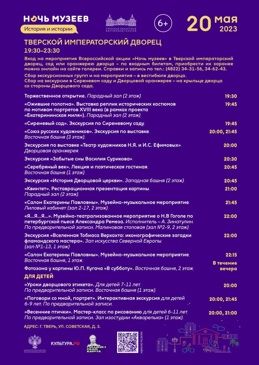 Например, к акции присоединится Тверская областная картинная галерея. В Тверском императорском дворце события Ночи музеев стартуют в 19:30 с торжественного открытия программы. Для гостей приготовили выставки, экскурсии, музейно-музыкальные мероприятия (6+).