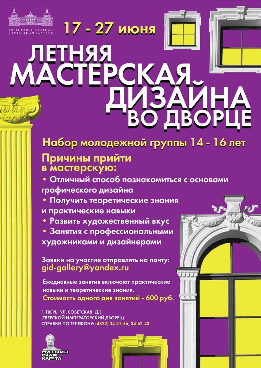 Занятия пройдут с 17 по 27 июня по будням, с 11:00 до 14:00. В том числе они доступны по Пушкинской карте. Заявки на участие принимаются по электронной почте gid-gallery@yandex.ru с пометкой «Летняя мастерская».