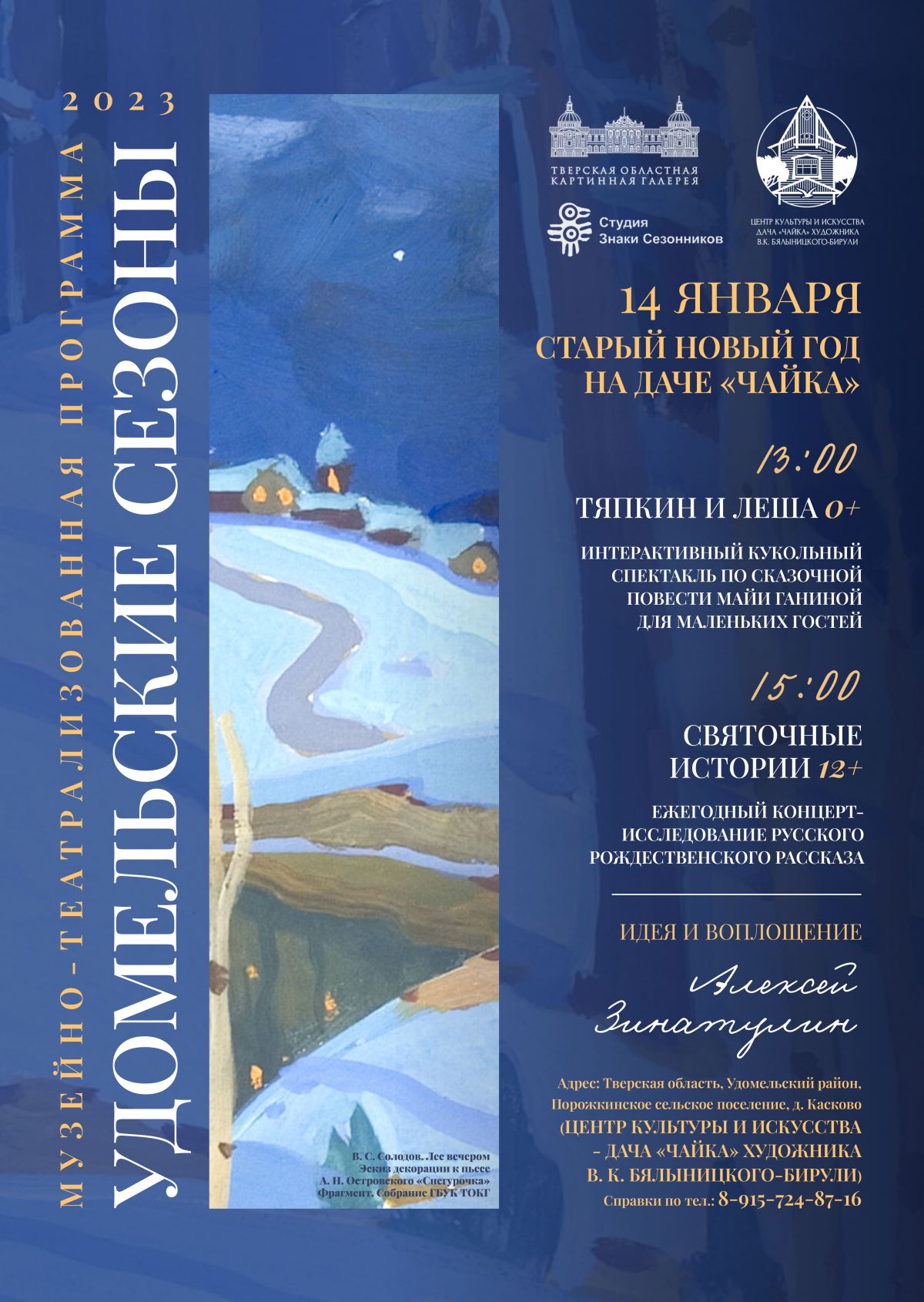 В 13:00 для маленьких гостей состоится интерактивный кукольный спектакль «Тяпкин и Леша» (0+) по сказочной повести Майи Ганиной, а в 15:00 - ежегодный концерт-исследование русского рождественского рассказа «Святочные истории» (12+), в котором прозвучат как полюбившиеся театральные миниатюры, так и новые премьерные новеллы.