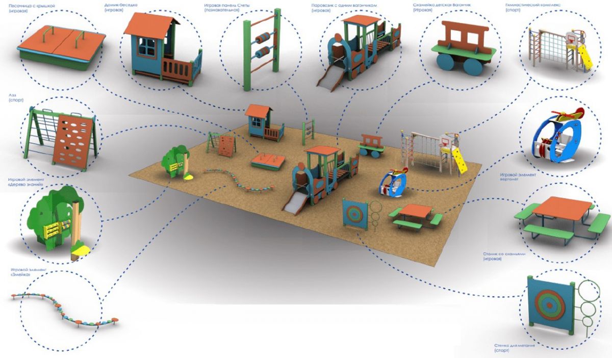 Они будут включать в себя 12 объектов: песочницу, домик-беседку, игровую панель, паровозик, гимнастический комплекс и другие игровые элементы.