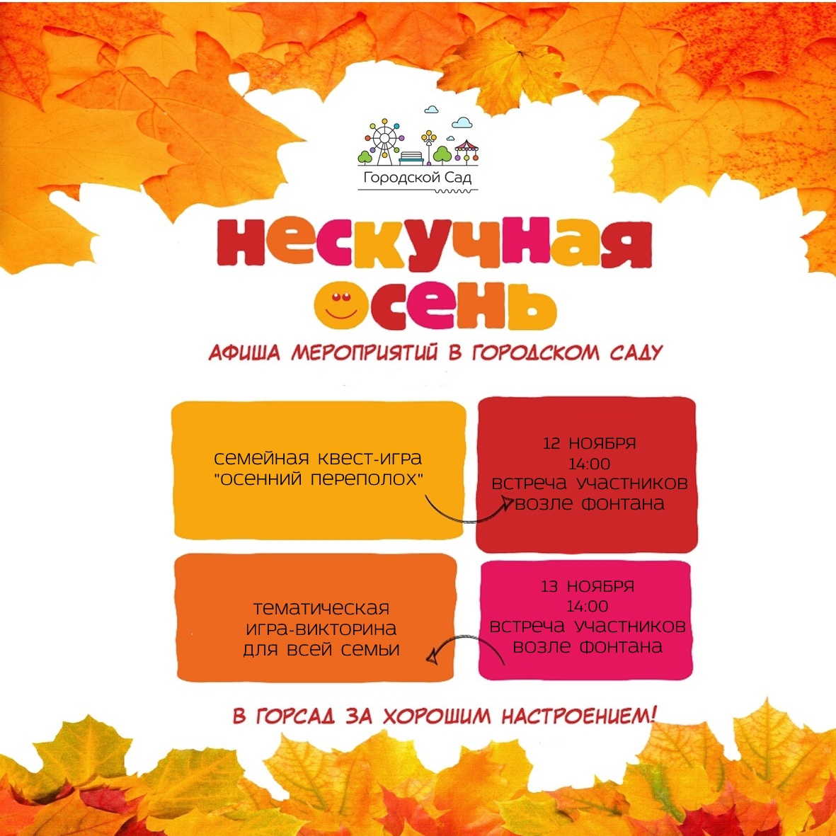 В субботу, 12 ноября, в 14:00 на площадке возле фонтана начнётся семейная квест-игра «Осенний переполох».