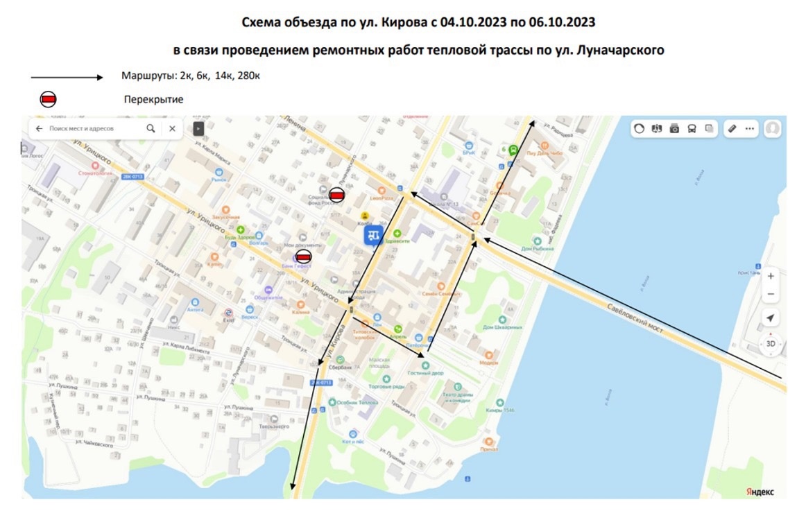С 4 по 6 октября включительно в связи с проведением ремонтных работ тепловой трассы в Кимрах будет ограничено движение транспорта по улице Луначарского на участке от улицы Карла Маркса до улицы Ленина.