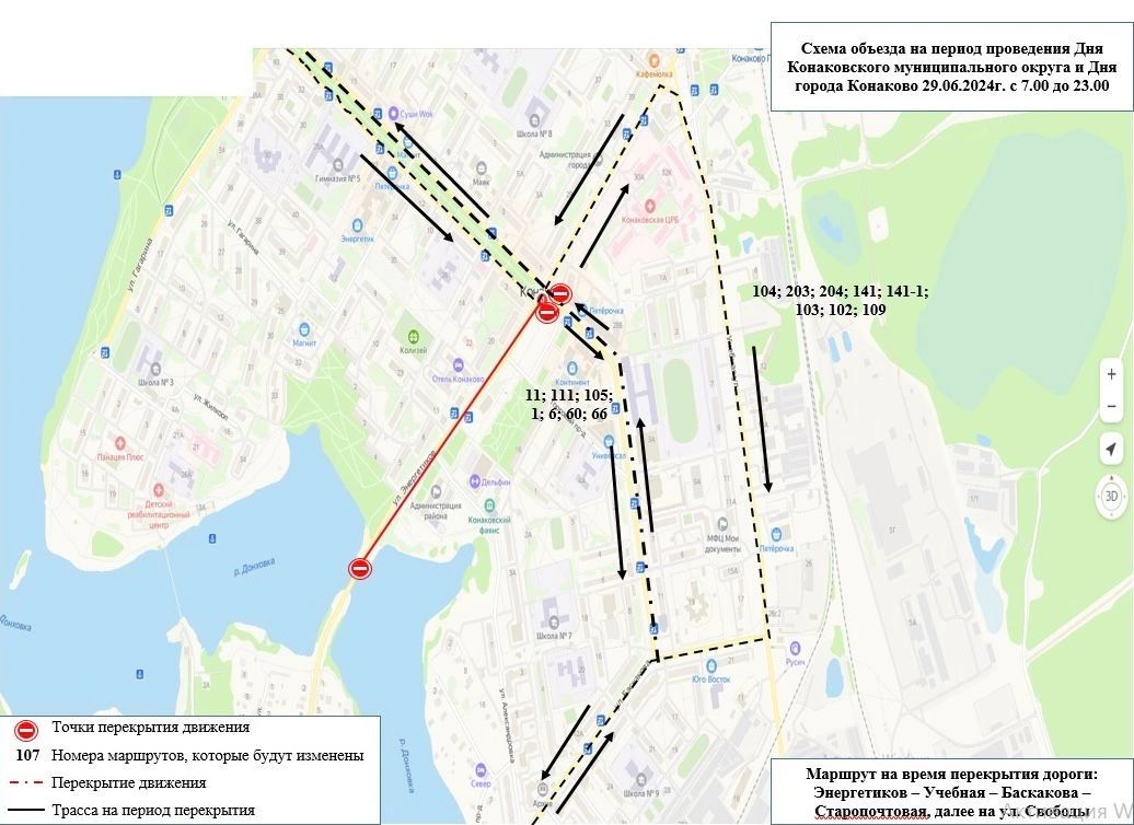 • автобусы №1, №6, №11, №60, №66, №104, №105, №111 будут следовать по маршруту: ул.Энергетиков – ул.Баскакова – ул.Старопочтовая и далее по маршруту.