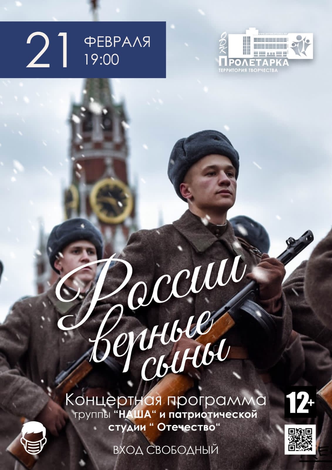 ДК «Пролетарка» анонсировал концерт «России верные сыны!». На сцене Большого концертного зала прозвучат патриотические песни в исполнении группы «НАША» и солистов Народной студии патриотической песни ДК «Пролетарка».