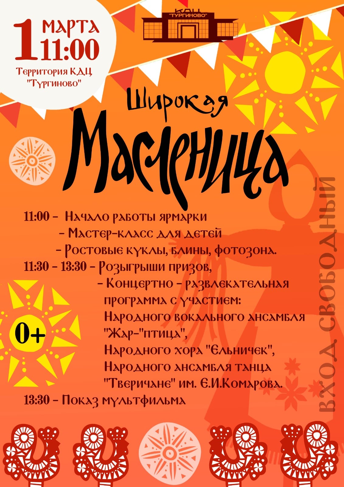 Творческие номера в честь народного праздника представят лучшие коллективы и студии КДЦ «Тургиново» и Тверского областного Дворца культуры «Пролетарка». А в 13:30 самых маленьких гостей приглашают на показ мультфильма «Двенадцать месяцев» в киноконцертном зале.