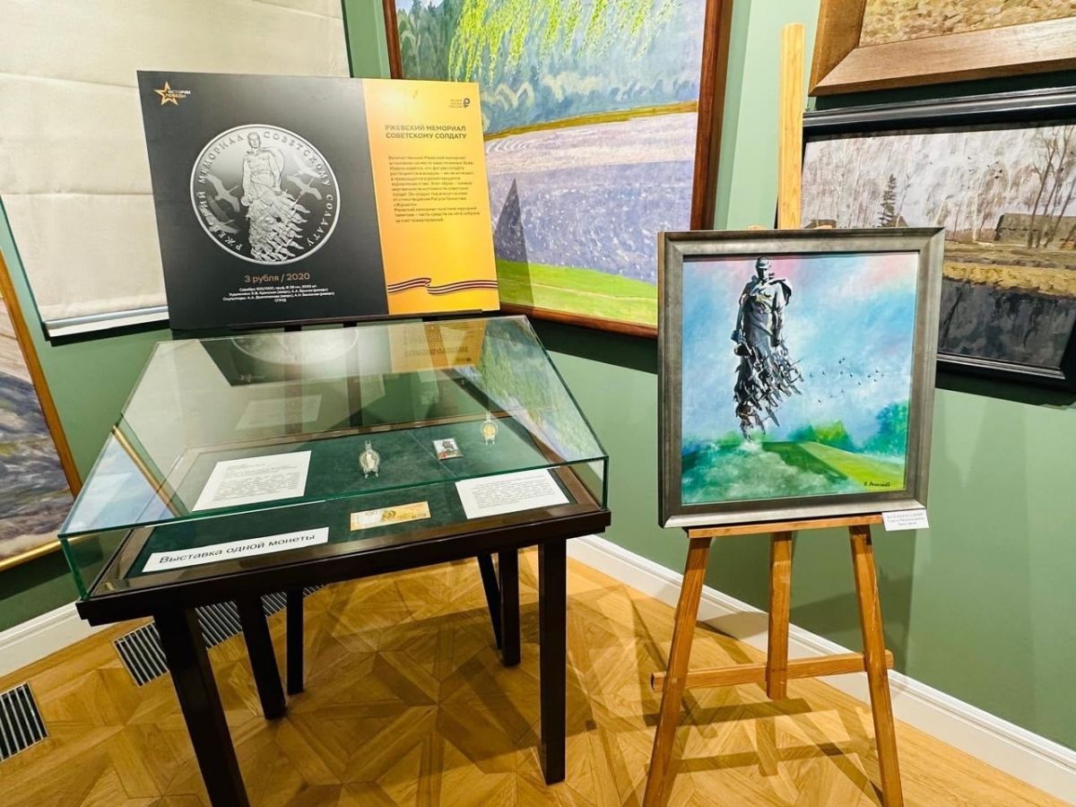 Первая монета, представленная на выставке, посвящена Ржевскому мемориалу Советскому солдату. Это памятная серебряная монета номиналом 3 рубля, на которой изображена центральная часть мемориального комплекса. Ознакомиться с ней можно до 4 сентября.